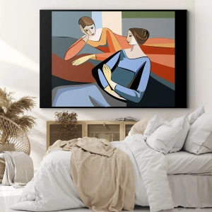 Obraz na płótnie - Kubistyczna ilustracja dwóch kobiet w stylowych kolorach - 50x70cm - Chwila zwierzeń - Nowoczesna dekoracja ścienna do salonu, kuchni i sypialni ARTTOR