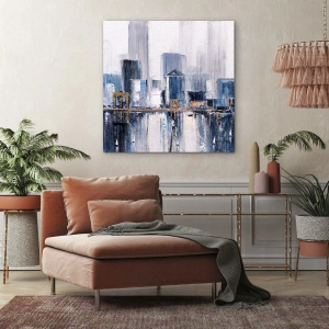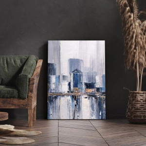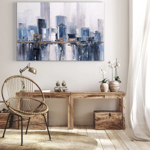 Obraz na płótnie - Abstrakcyjna panorama miasta w odcieniach błękitu i bieli - 50x70cm - Nowojorska impresja - Nowoczesna dekoracja ścienna do salonu, kuchni i sypialni ARTTOR