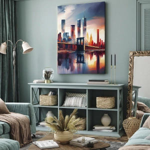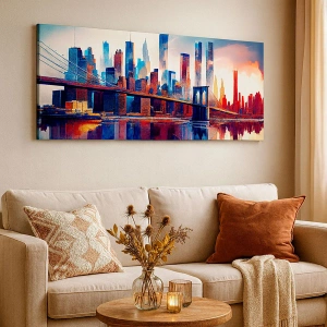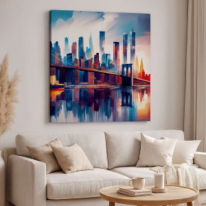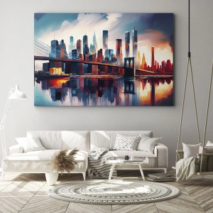 - Obraz na płótnie przedstawiający panoramę Nowego Jorku z mostem i odbiciem w wodzie. Idealny dodatek do nowoczesnych wnętrz, podkreślający miejski styl.
