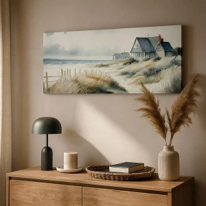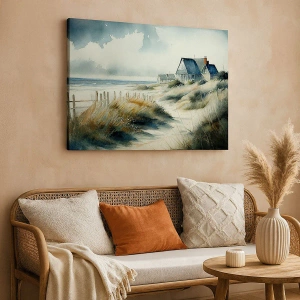 "Z dala od zgiełku" to obraz na płótnie o wymiarach 70x50cm w formacie poziomym, który w subtelny sposób ukazuje urok nadmorskiego pejzażu. Przedstawia dom położony w malowniczej scenerii nadmorskich traw z widokiem na spokojne morze. Akwarelowy styl nadaje całości lekkości i artystycznego wyrazu.