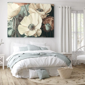 "Szept maków" to obraz na płótnie o wymiarach 70x50cm w formacie poziomym, który zachwyca subtelnością i elegancją. Przedstawia kwiaty w pastelowych odcieniach, harmonijnie kontrastujące z głębokim zielonym tłem. Detale przedstawienia podkreślają artystyczny charakter obrazu.