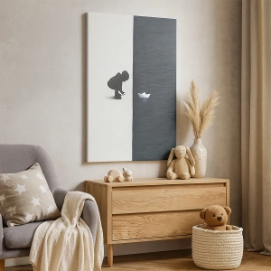Obraz skupia się na subtelności emocji i wyrazistości formy, wprowadzając do wnętrz atmosferę refleksji i harmonii. Kontrastowe tło podkreśla centralny motyw dziecka z łódką, tworząc wizualnie intrygujący efekt, który inspiruje i pobudza wyobraźnię.
