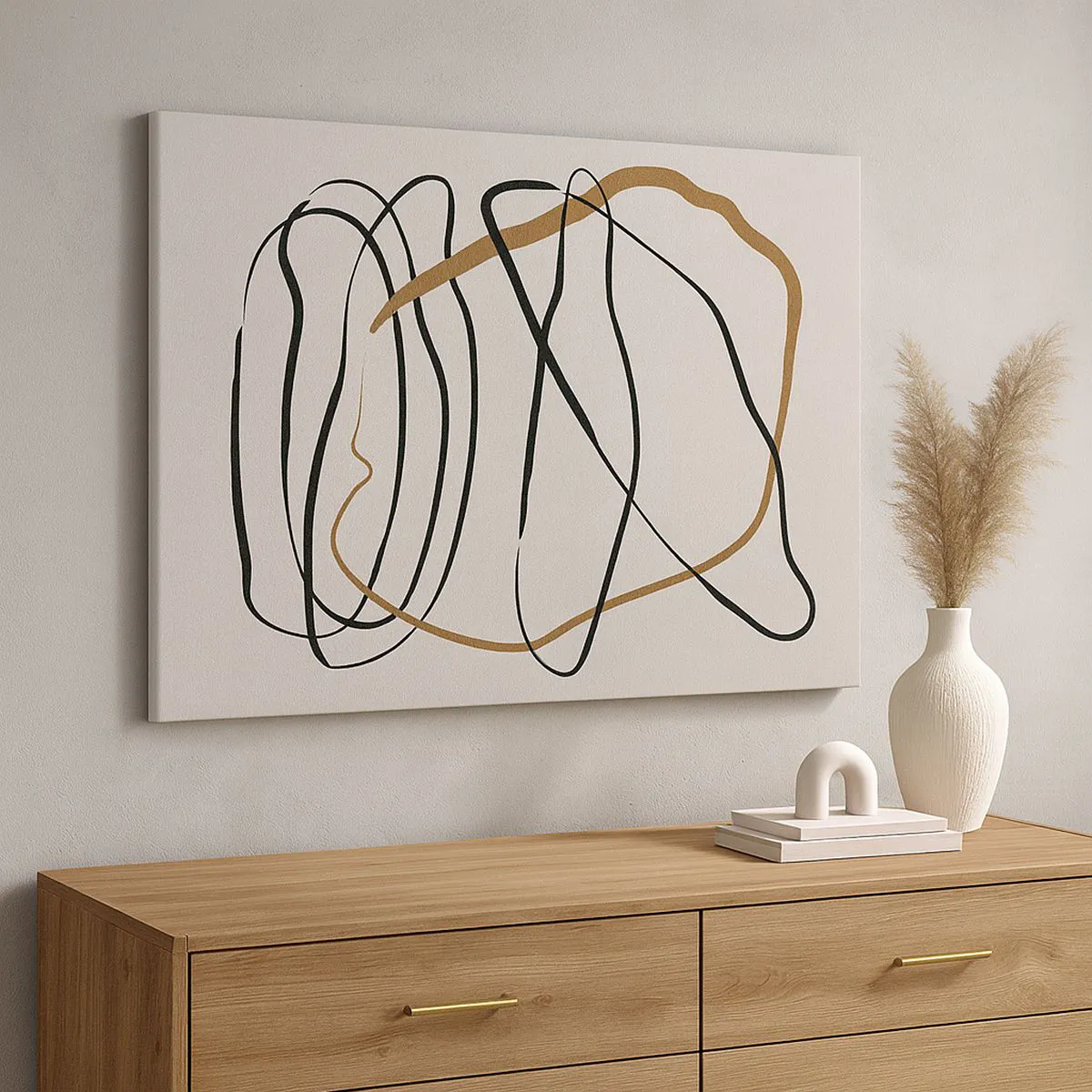 Obraz na płótnie - Artystyczne linie w czerni i złocie na jasnym tle - 100x70cm - Kompozycja – taniec opętaniec - Nowoczesna dekoracja ścienna do salonu, kuchni i sypialni ARTTOR