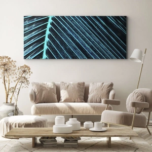 Obraz na płótnie - Makrofotografia liścia w odcieniach turkusu i granatu - 160x50cm - Faktura zieleni - Nowoczesna dekoracja ścienna do salonu i sypialni ARTTOR