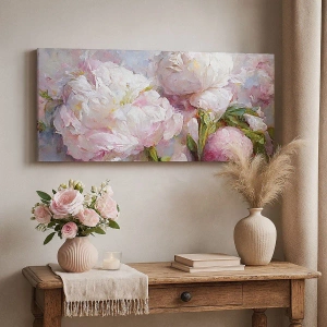 Obraz na płótnie - Malarska kompozycja przedstawiająca kwitnące piwonie w pastelowych barwach - 50x70cm - Kipiący życiem bukiet - Nowoczesna dekoracja ścienna do salonu, kuchni i sypialni ARTTOR