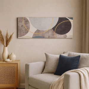 Delikatne linie okręgów i zbalansowane proporcje tworzą obraz pełen harmonii. Szarość i błękit wprowadzają spokój, podczas gdy akcenty złota dodają kompozycji ciepła i luksusowego charakteru. Tekstura obrazu podkreśla jego wyjątkowy styl, czyniąc go doskonałym punktem centralnym w każdej przestrzeni.