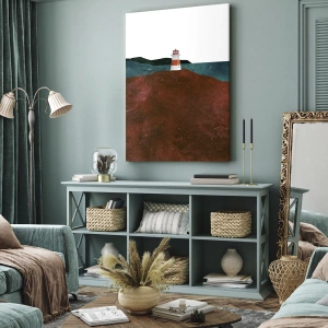 Obraz na płótnie - Latarnia morska na tle gór i morza - 100x70cm - Wpatrzona w morze - Nowoczesna dekoracja ścienna do salonu, kuchni i sypialni ARTTOR