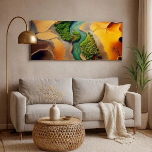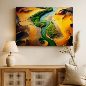 - Obraz przedstawiający zieloną rzekę wijącą się wśród złotych piasków i bujnej roślinności. Wyjątkowy krajobraz o intensywnych barwach dodaje wnętrzom harmonii i energii.