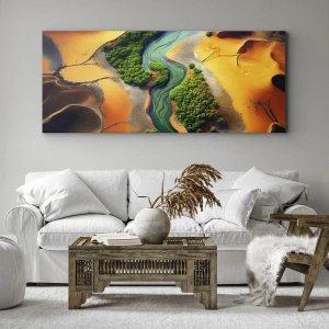Obraz na płótnie - Zielona rzeka w otoczeniu złotych piasków i roślinności - 80x120cm - Życiodajna rzeka - Nowoczesna dekoracja ścienna do salonu i sypialni ARTTOR