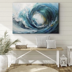 Obraz na płótnie "Morski portal" to wyjątkowa dekoracja, która zachwyca dynamiczną kompozycją i intensywnymi kolorami. Główna część obrazu przedstawia potężną, wirującą falę w odcieniach błękitu i turkusu, która zdaje się ożywiać i wprowadzać ruch do każdej przestrzeni.