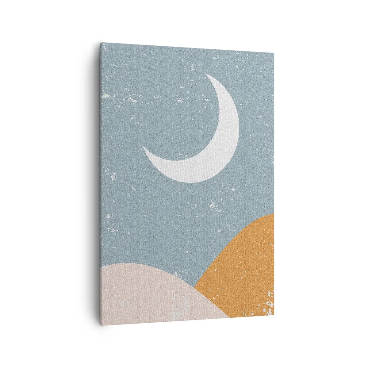 Obraz na płótnie - Półksiężyc na błękitnym tle z abstrakcyjnymi wzgórzami - 70x100cm - Cud wielu nocy - Nowoczesna dekoracja ścienna do salonu i sypialni ARTTOR