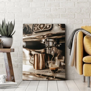 Obraz na płótnie - Ekspres do kawy nalewający aromatyczne espresso do szklanej filiżanki - 70x100cm - Blask kawy - Nowoczesna dekoracja ścienna do salonu i sypialni ARTTOR