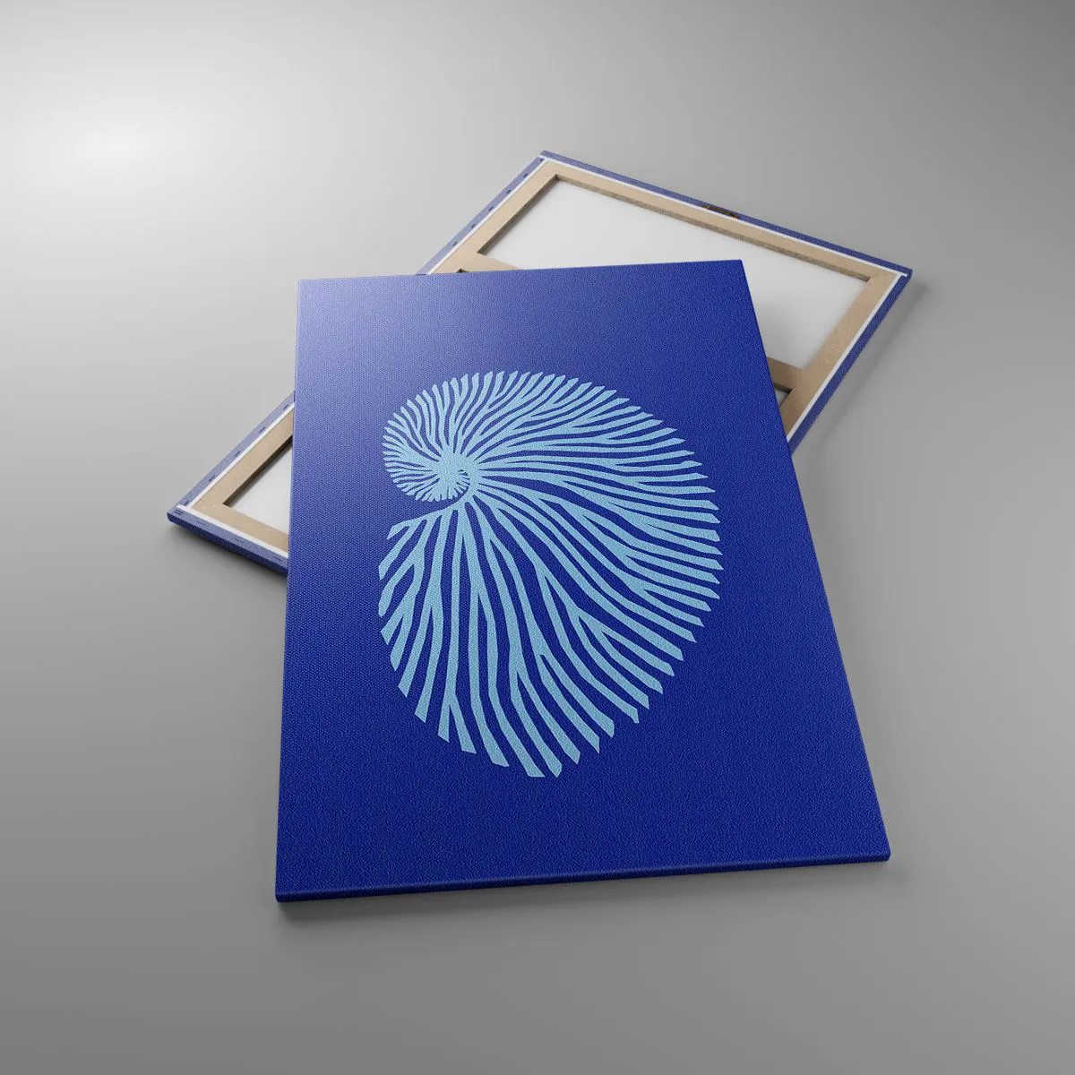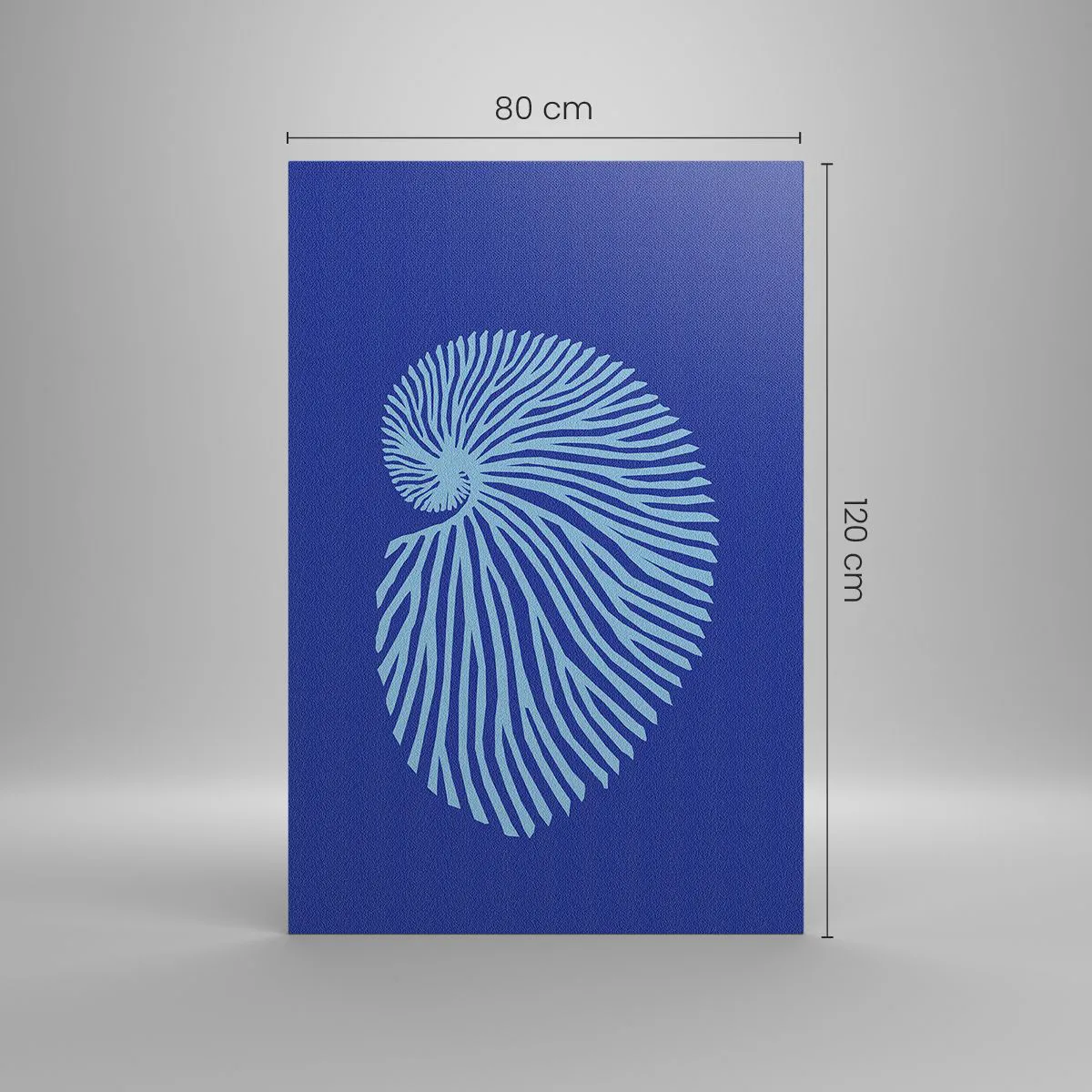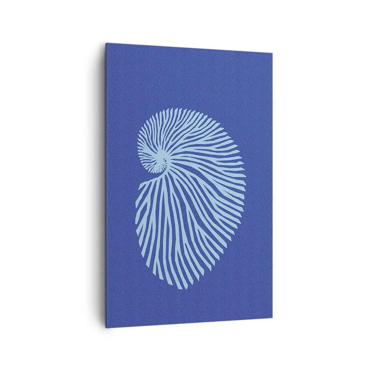 Obraz na płótnie - Minimalistyczna grafika muszli spiralnej w odcieniach błękitu na ciemnym tle - 80x120cm - Narodziny muszli - Nowoczesna dekoracja ścienna do salonu i sypialni ARTTOR