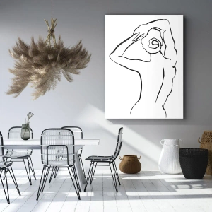 Obraz na płótnie - Minimalistyczna linia konturowa kobiecej sylwetki widzianej od tyłu na białym tle - 50x70cm - Akt o poranku - Nowoczesna dekoracja ścienna do salonu, kuchni i sypialni ARTTOR