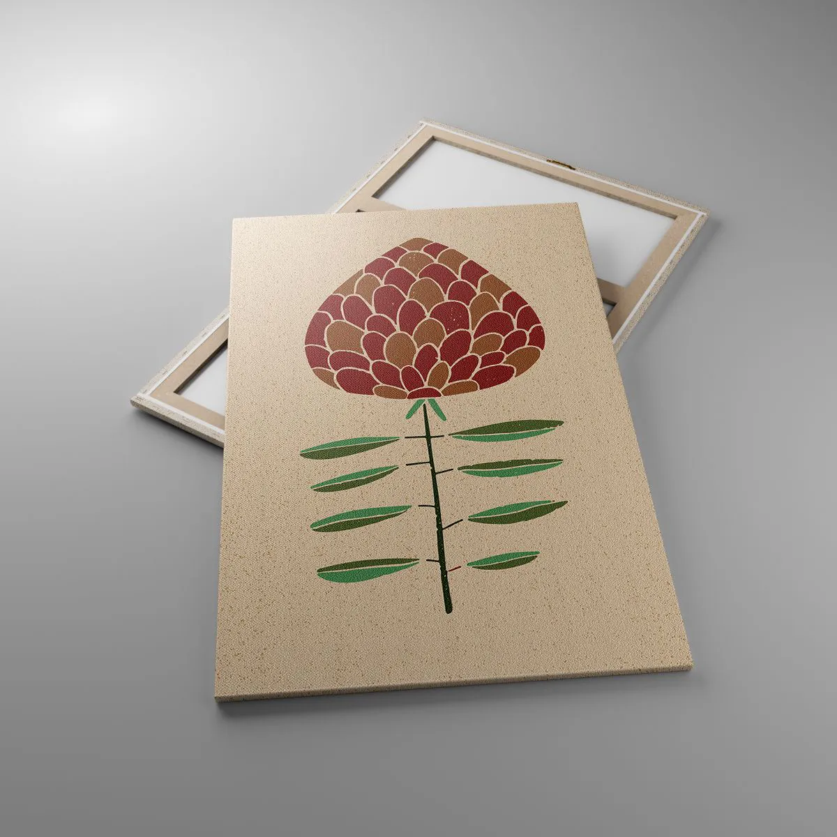 Obraz na płótnie - Geometryczna ilustracja kwiatu w odcieniach czerwieni i zieleni na beżowym tle - 80x120cm - Jak wielka szycha - Nowoczesna dekoracja ścienna do salonu i sypialni ARTTOR
