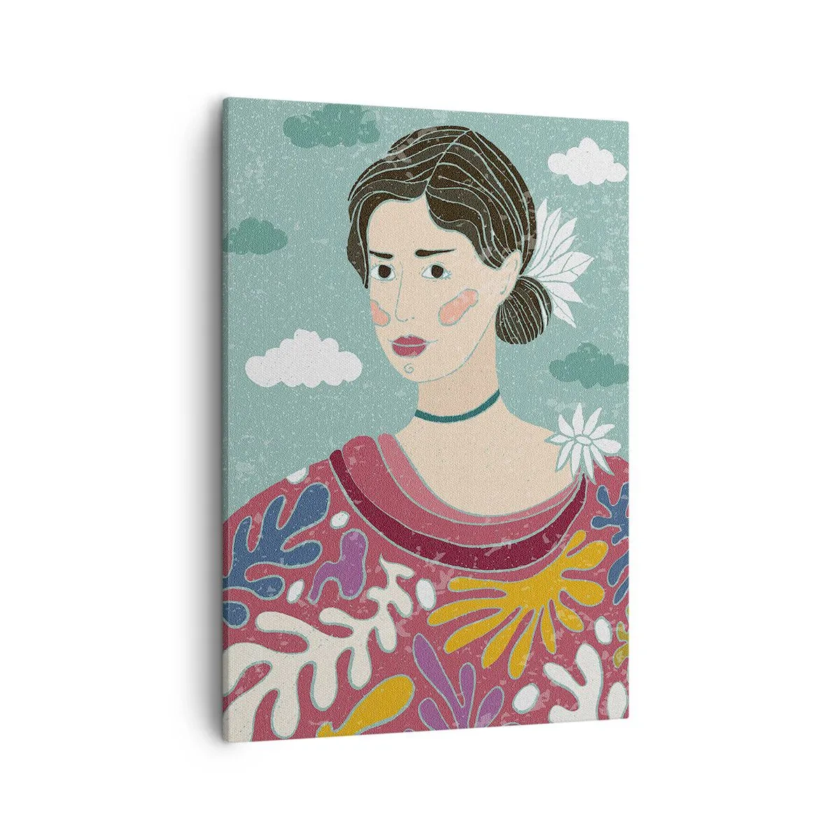 Obraz na płótnie - Portret kobiety w artystycznym stylu z florystycznymi wzorami na tle chmur - 50x70cm - Z melancholią w spojrzeniu - Nowoczesna dekoracja ścienna do salonu, kuchni i sypialni ARTTOR