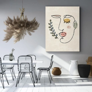 Obraz na płótnie - Minimalistyczny rysunek twarzy z roślinnym motywem na jasnym tle - 50x70cm - Spokój odnaleziony - Nowoczesna dekoracja ścienna do salonu, kuchni i sypialni ARTTOR