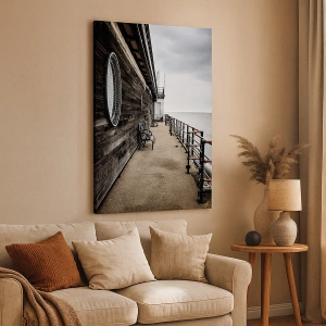 Obraz na płótnie - Drewniane nabrzeże z ławkami i widokiem na morze w pochmurny dzień - 50x70cm - Czas zatrzymany - Nowoczesna dekoracja ścienna do salonu, kuchni i sypialni ARTTOR