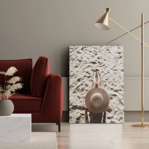Obraz na płótnie - Kobieta w słomkowym kapeluszu leżąca na piasku - 50x70cm - Wymarzony czas - Nowoczesna dekoracja ścienna do salonu, kuchni i sypialni ARTTOR