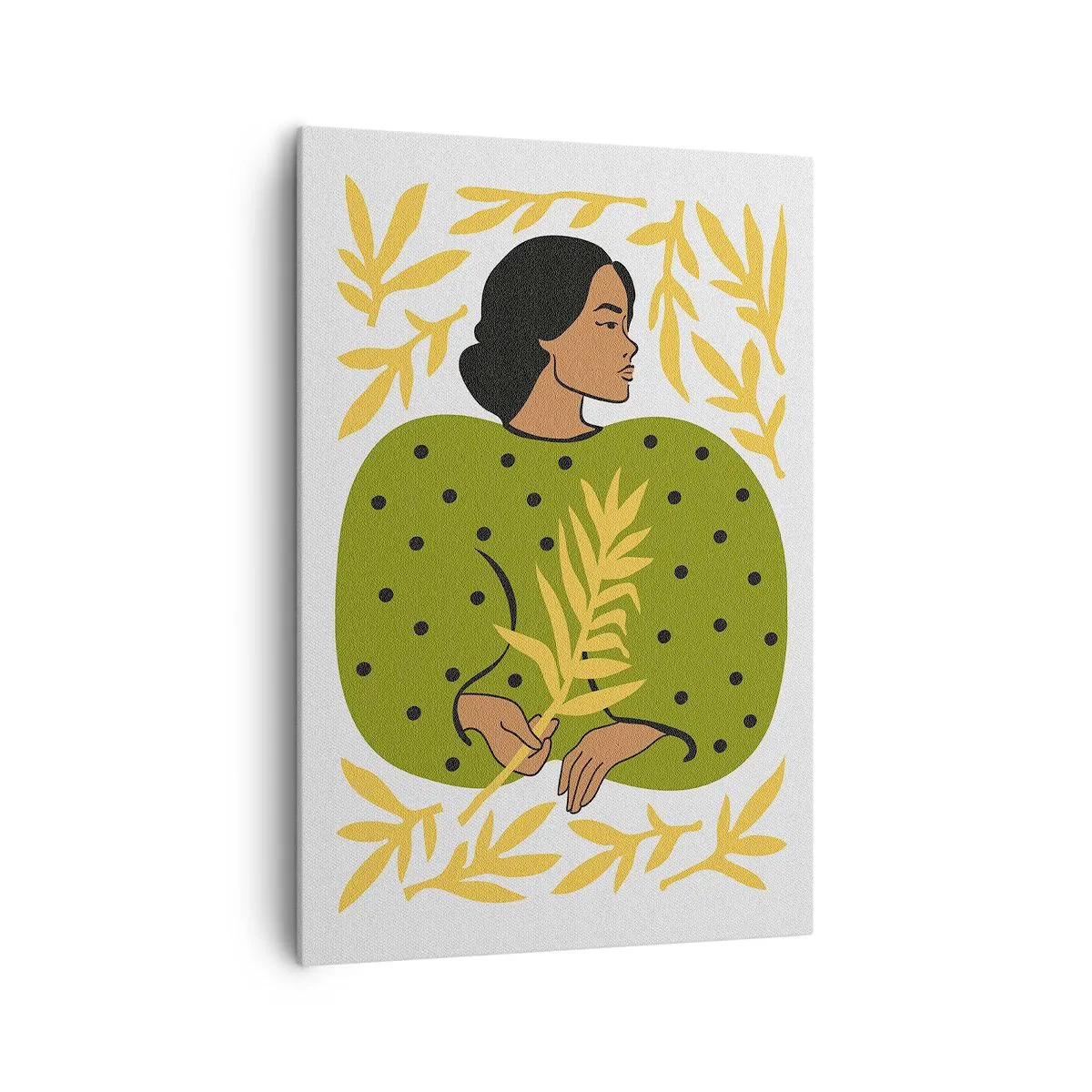 Obraz na płótnie - Kobieta w zielonej sukni z liściastym motywem na jasnym tle - 70x100cm - Hawajska dziewczyna - Nowoczesna dekoracja ścienna do salonu i sypialni ARTTOR