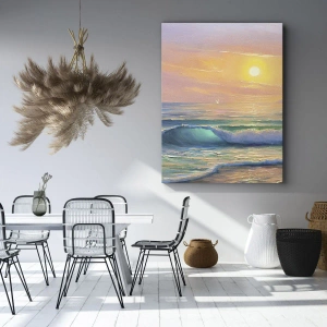 "Turkusowa pieśń fal" to wyjątkowy obraz na płótnie przedstawiający malowniczy widok morza podczas zachodu słońca. Dominują pastelowe barwy, które wspaniale oddają klimat letniego wieczoru. Falujące wody i miękkie światło tworzą kompozycję pełną harmonii i spokoju, idealną do wprowadzenia relaksującej atmosfery w każdym wnętrzu.