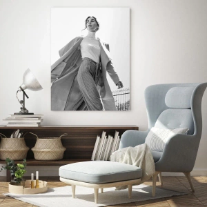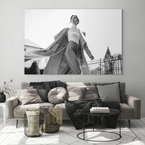 Obraz na szkle - Stylowa kobieta w ruchu na tle miejskiej architektury - 50x70cm - Idziesz ze mną? - Nowoczesna dekoracja ścienna do salonu, kuchni i sypialni ARTTOR