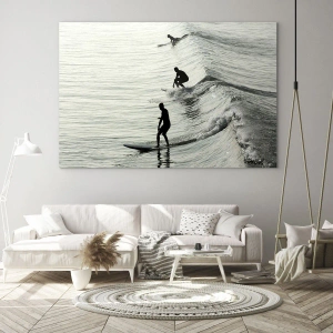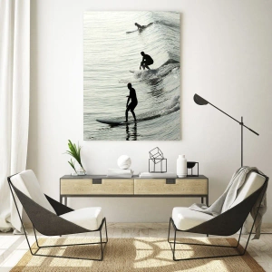 To obraz, który idealnie oddaje ducha wolności, odwagi i skupienia. Każdy z trzech surferów znajduje się w innej fazie jazdy, co sprawia, że kompozycja zyskuje dynamikę. Widz od razu przenosi się myślami na nadmorską plażę, gdzie wczesnym rankiem powietrze pachnie solą, a fale wzywają do działania. Minimalistyczne ujęcie podkreśla prostotę, a zarazem siłę tej chwili.