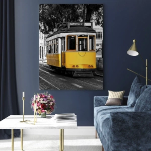 Obraz na szkle - Żółty tramwaj na tle czarno-białej uliczki - 70x100cm - I fado w tle - Nowoczesna dekoracja ścienna do salonu i sypialni ARTTOR