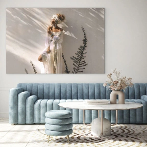Obraz skupia się na harmonii światła i cienia, prostocie tła i eleganckiej pozycji modelki. Motyw roślinnych cieni nadaje kompozycji subtelnej dynamiki, a naturalne barwy i miękkie linie tworzą wrażenie ciepła i bliskości z naturą. To dzieło sztuki nowoczesnej, które odzwierciedla trend powrotu do autentyczności i minimalizmu.