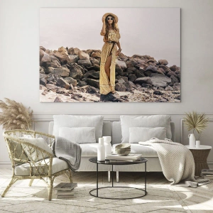 Obraz "Magia kamieni" to wyjątkowa kompozycja, która łączy kobiecą elegancję ze zmysłowością natury. Na pierwszym planie widzimy stylową kobietę ubraną w długą, zwiewną sukienkę w odcieniach żółci z delikatnym paskiem w talii. Kapelusz oraz ciemne okulary dopełniają jej letnią stylizację w duchu stylu boho, który podkreśla luz, wolność i bliskość z naturą. Postać kobiety została ukazana na tle skalistego brzegu, co tworzy kontrast między subtelnością sylwetki a surowością otoczenia.
