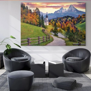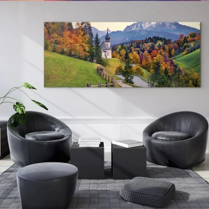 Obraz na szkle - Jesienny pejzaż górski z kościółkiem i drogą prowadzącą przez wzgórza - 120x80cm - Pejzaż jak malowanie - Nowoczesna dekoracja ścienna do salonu, kuchni i sypialni ARTTOR
