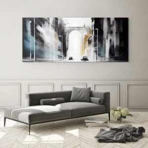 Obraz na szkle - Dynamiczna miejska ulica z samochodami i łukiem w tle w malarskim stylu - 120x80cm - Studium miasta: architektura i ruch - Nowoczesna dekoracja ścienna do salonu, kuchni i sypialni ARTTOR