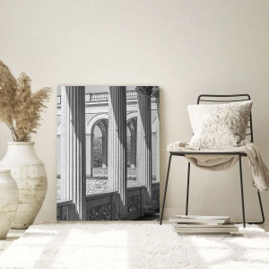 Obraz na szkle - Czarno-biała kolumnada z rytmiczną grą światła i cienia - 100x70cm - Słoneczna arkada - Nowoczesna dekoracja ścienna do salonu, kuchni i sypialni ARTTOR
