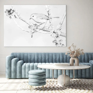Obraz na szkle - Ptak siedzący na gałęzi w zimowej, monochromatycznej scenerii - 120x80cm - Zimowy poranek - Nowoczesna dekoracja ścienna do salonu, kuchni i sypialni ARTTOR