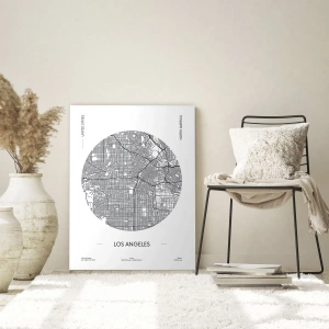 - Stylowa mapa Los Angeles w monochromatycznym stylu, przedstawiona w okrągłej kompozycji z zaznaczeniem struktury ulic i dzielnic. Minimalistyczna dekoracja o urbanistycznym charakterze.