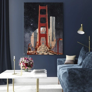 - Dynamiczne zestawienie miejskiej architektury z galaktycznym tłem. Czerwony most prowadzący przez miasto do surrealistycznego świata gwiazd. Obraz łączy elementy kosmosu z codziennością i miejskim klimatem.