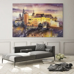 Obraz na szkle - Akwarelowa ilustracja zamku na wzgórzu o zachodzie słońca - 50x70cm - Historia i baśń - Nowoczesna dekoracja ścienna do salonu, kuchni i sypialni ARTTOR
