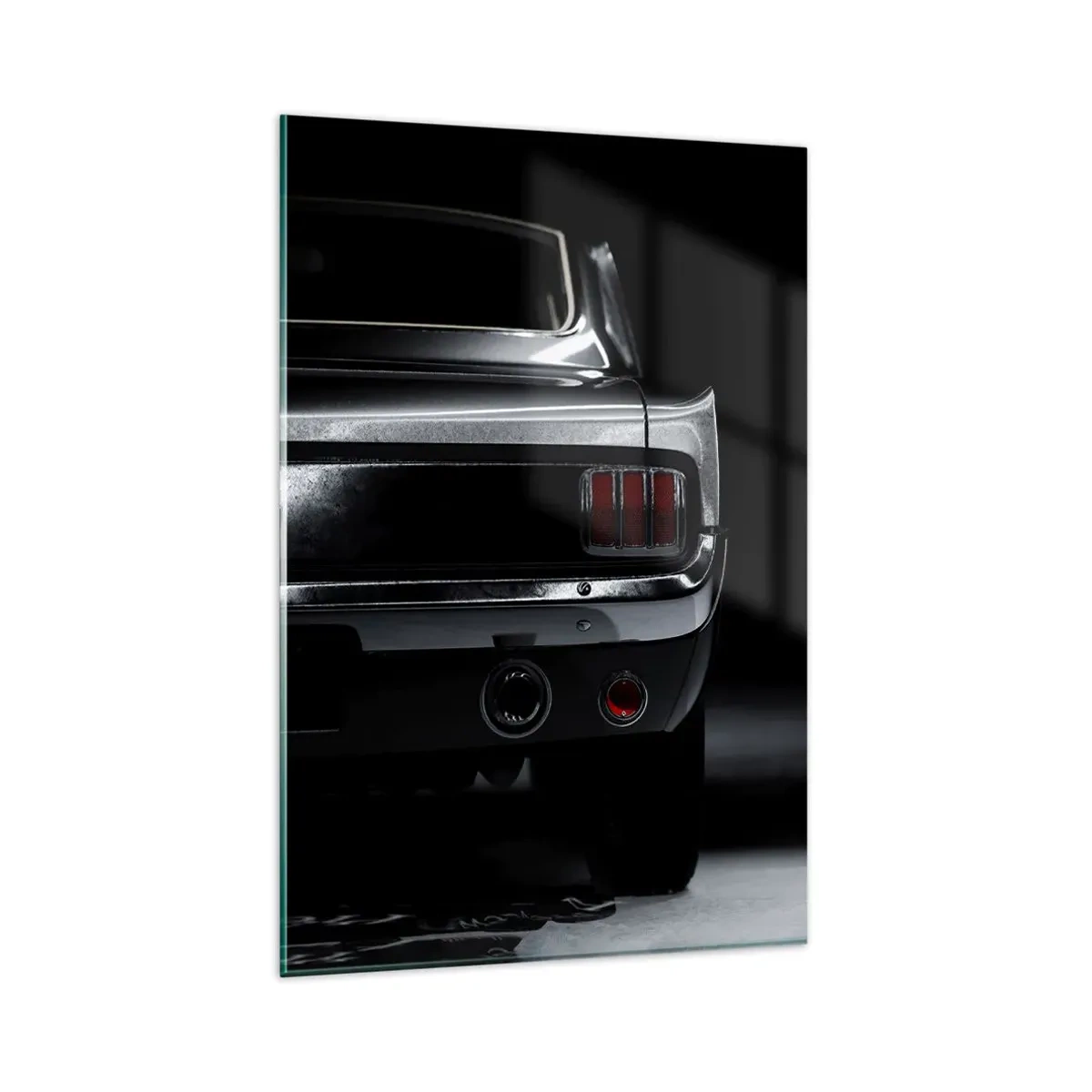Obraz na szkle - Czarno-biały obraz przedstawiający tylną część klasycznego samochodu na tle ciemnej przestrzeni - 80x120cm - Czar klasyki - Nowoczesna dekoracja ścienna do salonu i sypialni ARTTOR