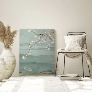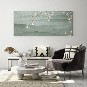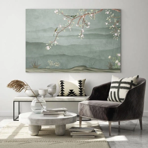 Obraz na szkle - Gałązka z kwiatami i ptakami na tle zielonych wzgórz - 50x70cm - Wiosna, ach, to ty - Nowoczesna dekoracja ścienna do salonu, kuchni i sypialni ARTTOR