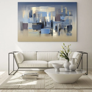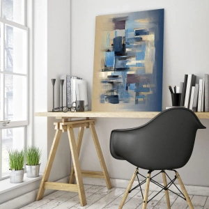 - Kompozycja abstrakcyjna złożona z geometrycznych pociągnięć pędzla w odcieniach błękitu, beżu i granatu. Obraz wprowadza do wnętrza elegancję i nowoczesną równowagę kolorystyczną.