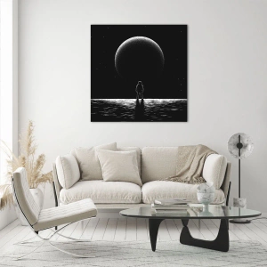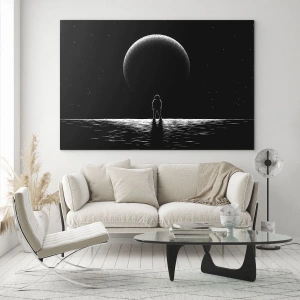 - Czarno-biały obraz na szkle z astronautą patrzącym na ogromną planetę. Minimalistyczna kompozycja pełna symboliki, idealna do nowoczesnych i industrialnych wnętrz z motywem science fiction.