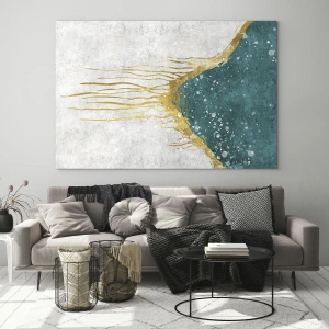 Obraz na szkle - Abstrakcyjna kompozycja w odcieniach złota i turkusu - 120x50cm - Złoty przypływ - Nowoczesna dekoracja ścienna do salonu i sypialni ARTTOR