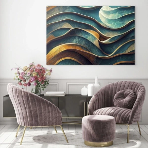 Obraz na szkle - Abstrakcyjne fale w odcieniach turkusu i złota - 140x50cm - Meandry błękitu - Nowoczesna dekoracja ścienna do salonu i sypialni ARTTOR
