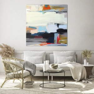 Obraz na szkle - Abstrakcyjna kompozycja z kolorowymi plamami i pociągnięciami - 120x80cm - Jest metoda? - Nowoczesna dekoracja ścienna do salonu, kuchni i sypialni ARTTOR