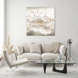 Obraz na szkle - Złote ptaki na tle mglistych gór - 160x50cm - Już czas… - Nowoczesna dekoracja ścienna do salonu i sypialni ARTTOR