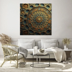 Obraz na szkle - Złota mandala na tle turkusowym z bogatymi detalami - 140x50cm - W arabskim klimacie - Nowoczesna dekoracja ścienna do salonu i sypialni ARTTOR