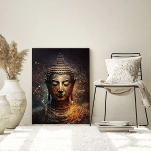Obraz na szkle - Złota postać Buddy na ciemnym tle z ornamentami - 50x70cm - Duchowa równowaga - Nowoczesna dekoracja ścienna do salonu, kuchni i sypialni ARTTOR