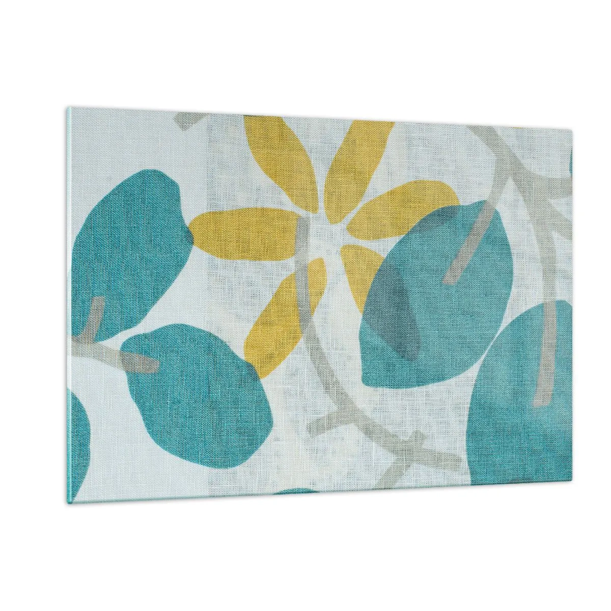 Obraz na szkle - Roślinna grafika z lazurowymi liśćmi i żółtymi kwiatami - 120x80cm - Wśród lazurowych liści - Nowoczesna dekoracja ścienna do salonu, kuchni i sypialni ARTTOR