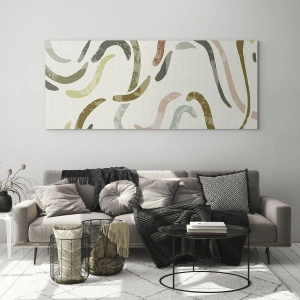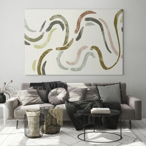 Kolorystyka obrazu została starannie dobrana – delikatne, naturalne barwy dobrze komponują się z nowoczesnymi i minimalizmycznymi wnętrzami. Faliste linie nie tylko ożywiają przestrzeń, ale również budują wrażenie płynności i swobody. Ten organiczny układ wpisuje się w estetykę stylu skandynawskiego i boho.