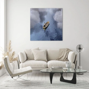 Obraz na szkle - Mężczyzna w łódce płynący przez wodę wśród obłoków - 100x70cm - Życie – podróż – niewiadoma - Nowoczesna dekoracja ścienna do salonu, kuchni i sypialni ARTTOR